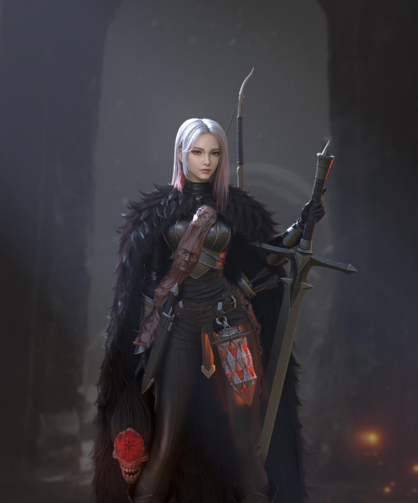 女人、战士、头、银发、大剑、毛皮、剑、武器、盔甲