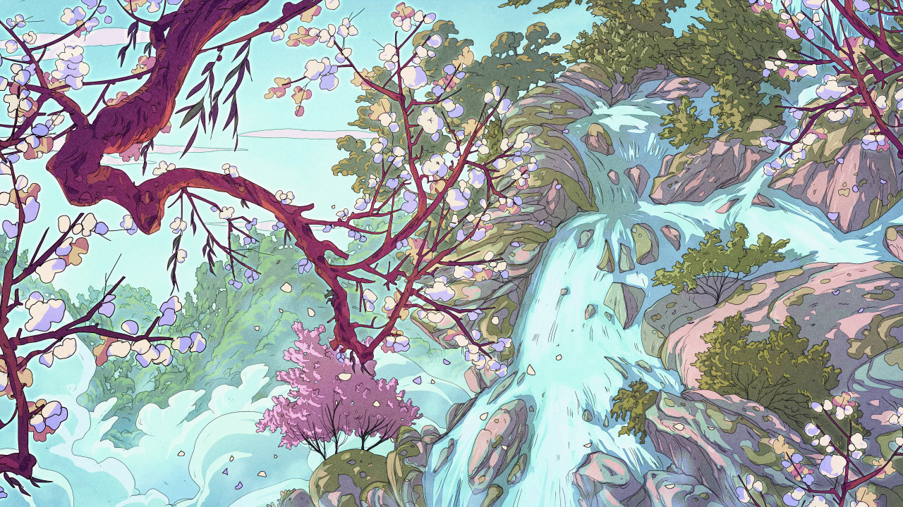 AI艺术、奇幻艺术、瀑布、花瓣、水