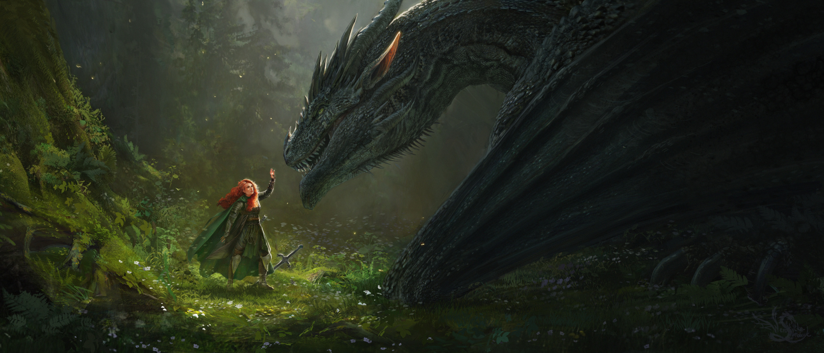 女人、红发、奇幻女孩、奇幻艺术、龙