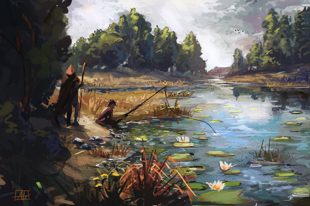 渔夫、山羊、早餐、数码绘画、风景、河流