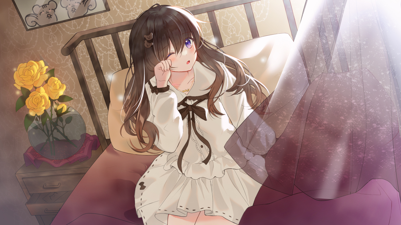 深色头发、动漫、动漫女孩、紫色眼睛、连衣裙