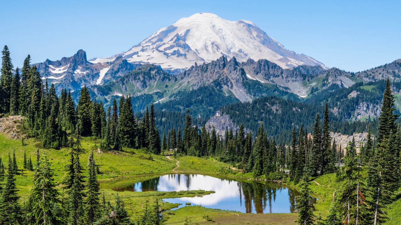 自然、风景、山脉、森林、湖泊、倒影、天空、雪