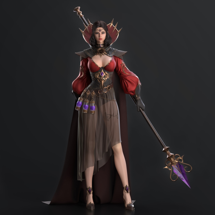 女人、黑发、蓝眼睛、连衣裙、武器、法杖、药水、长袍、红色衣服