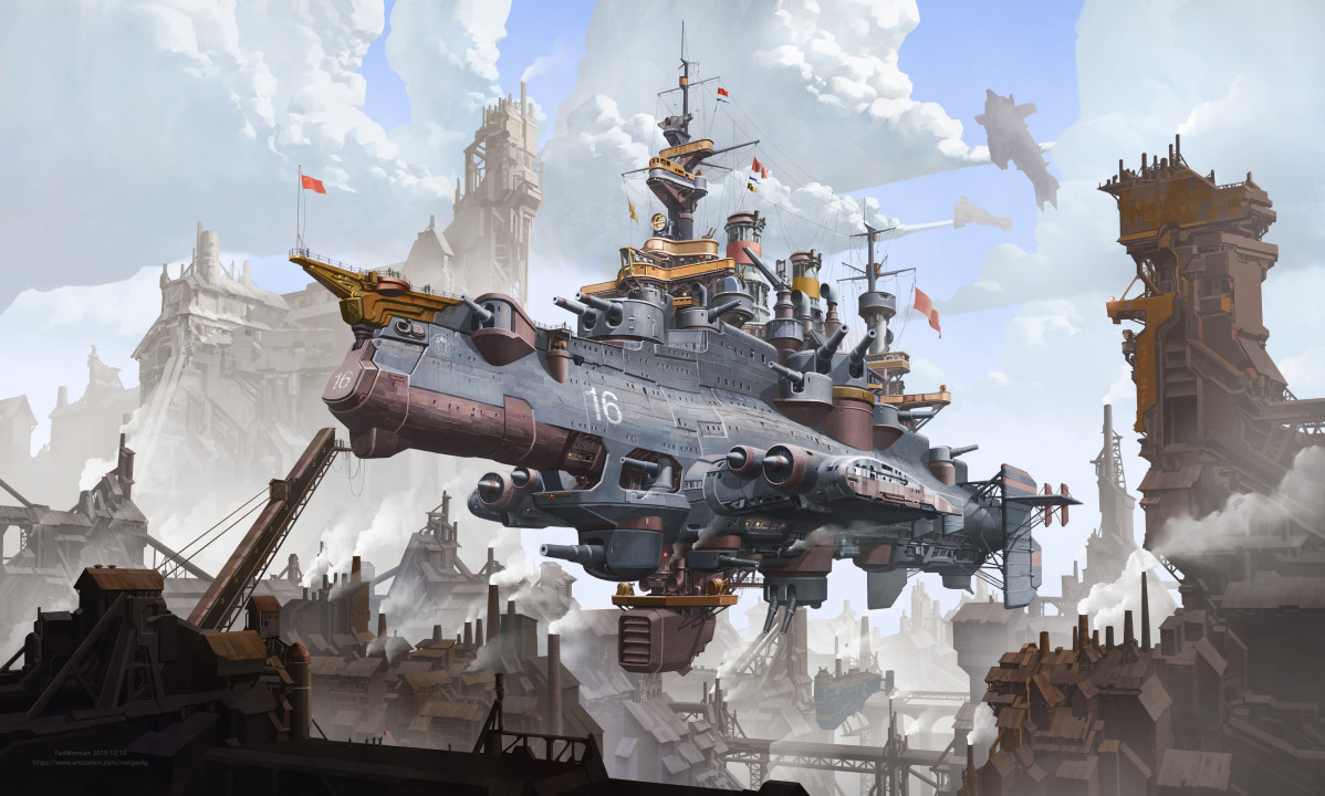 范文楠、插画、科幻、飞艇、蒸汽朋克、数码艺术、云