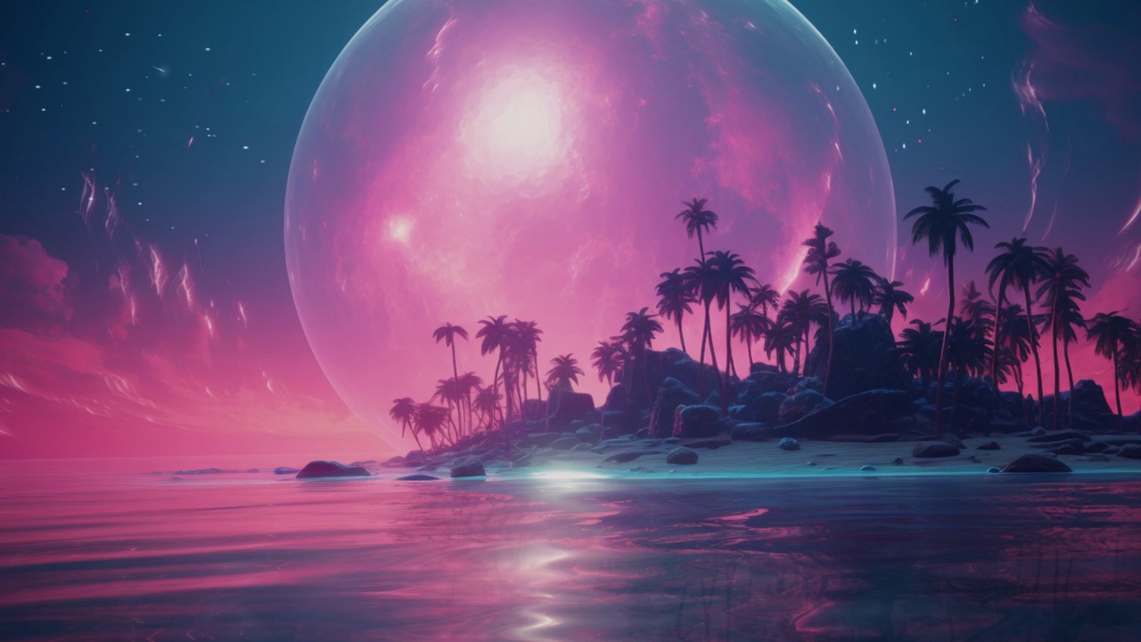 数字艺术、艺术品、插图、数字、绘画、风景、云、月亮、棕榈树、日落、星星
