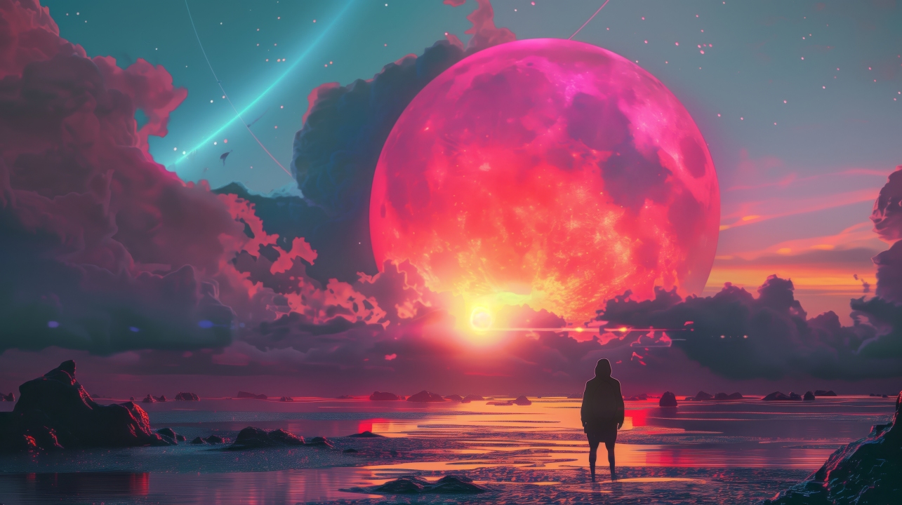 AI艺术、插画、云、月亮、海岸、水、五颜六色、镜头光斑