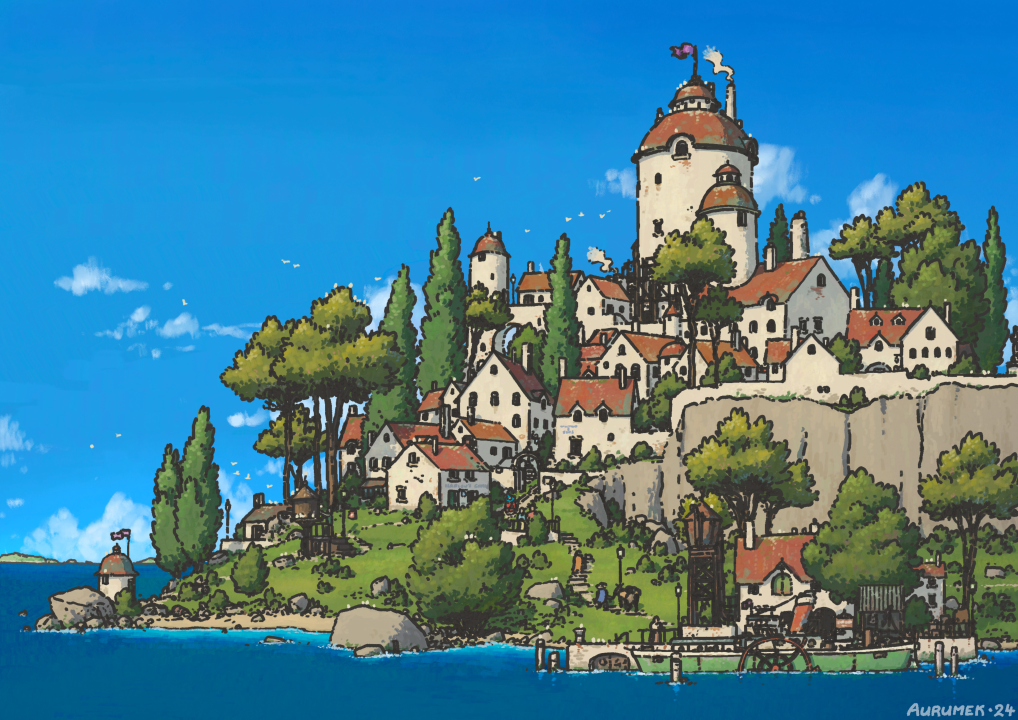 艺术品、数字艺术、数字绘画、风景、自然、城镇、海洋、水、树木