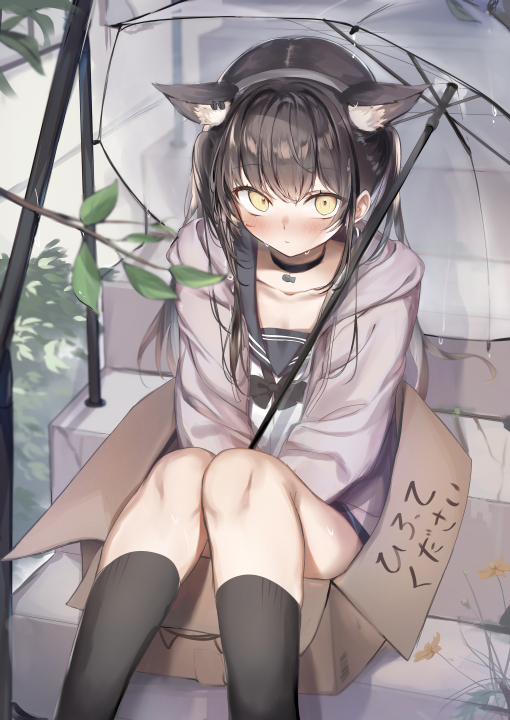 深色头发、动漫、女孩、AI艺术、校服、雨伞、猫耳、黄眼睛、脸红、汗水、楼梯