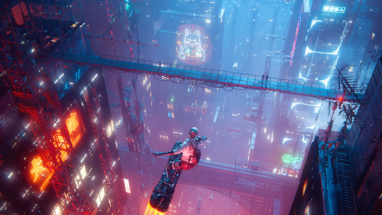 赛博朋克城市中的未来飞行