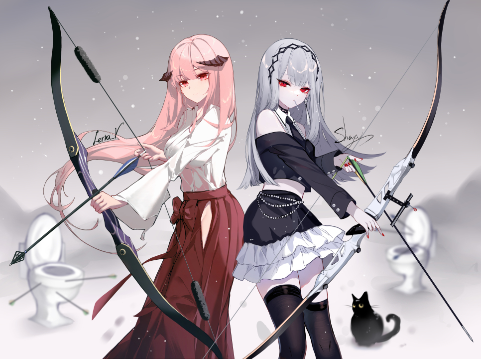 粉色头发、红色眼睛、动漫、女孩、AI艺术、银发、弓、箭、马桶、猫、角