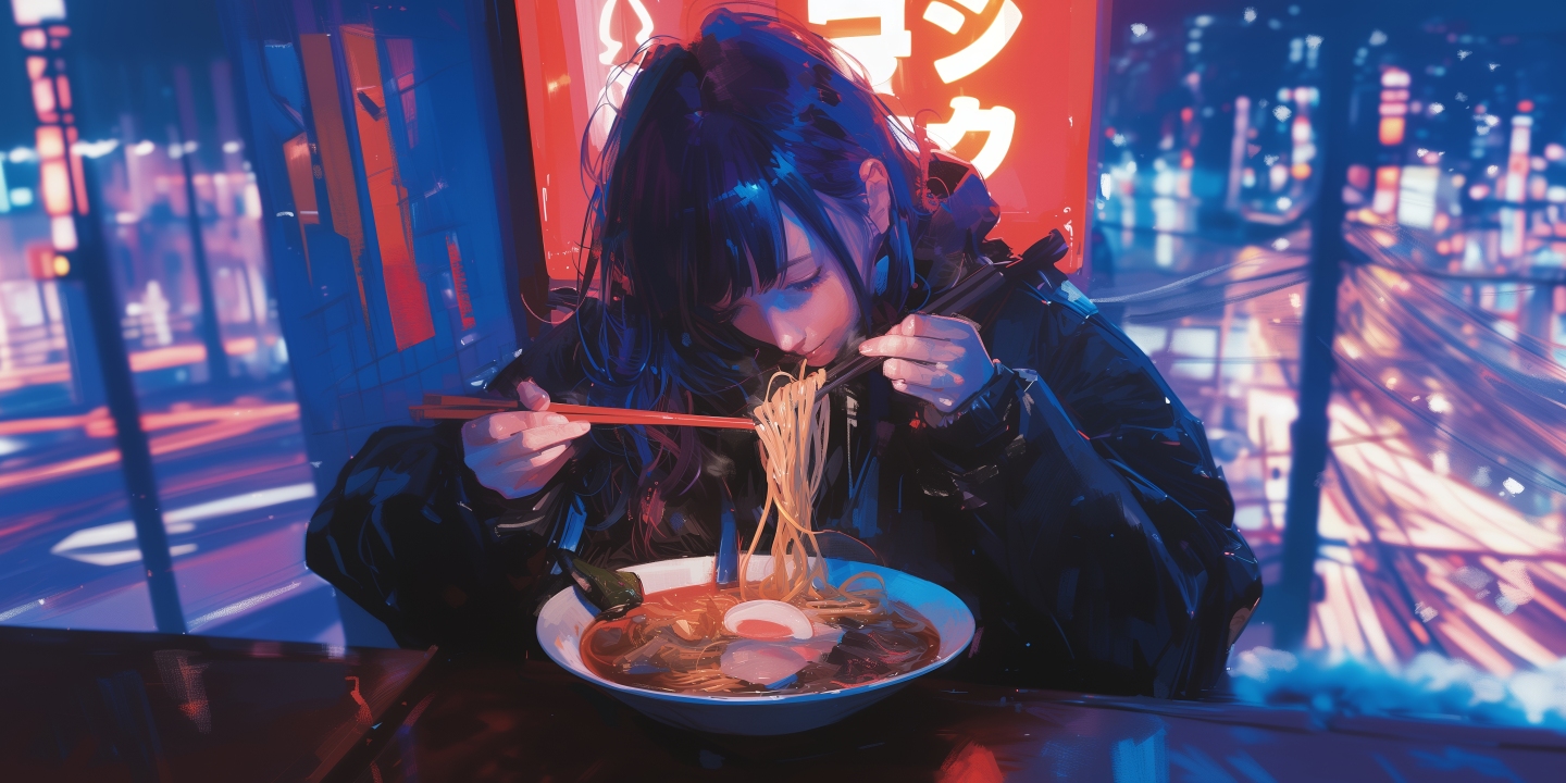 女人、AI艺术、插图、吃、面条、蓝色、城市、绘画