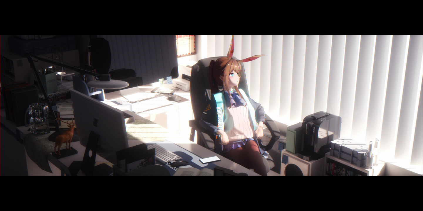 动漫女孩在阳光下的办公桌前