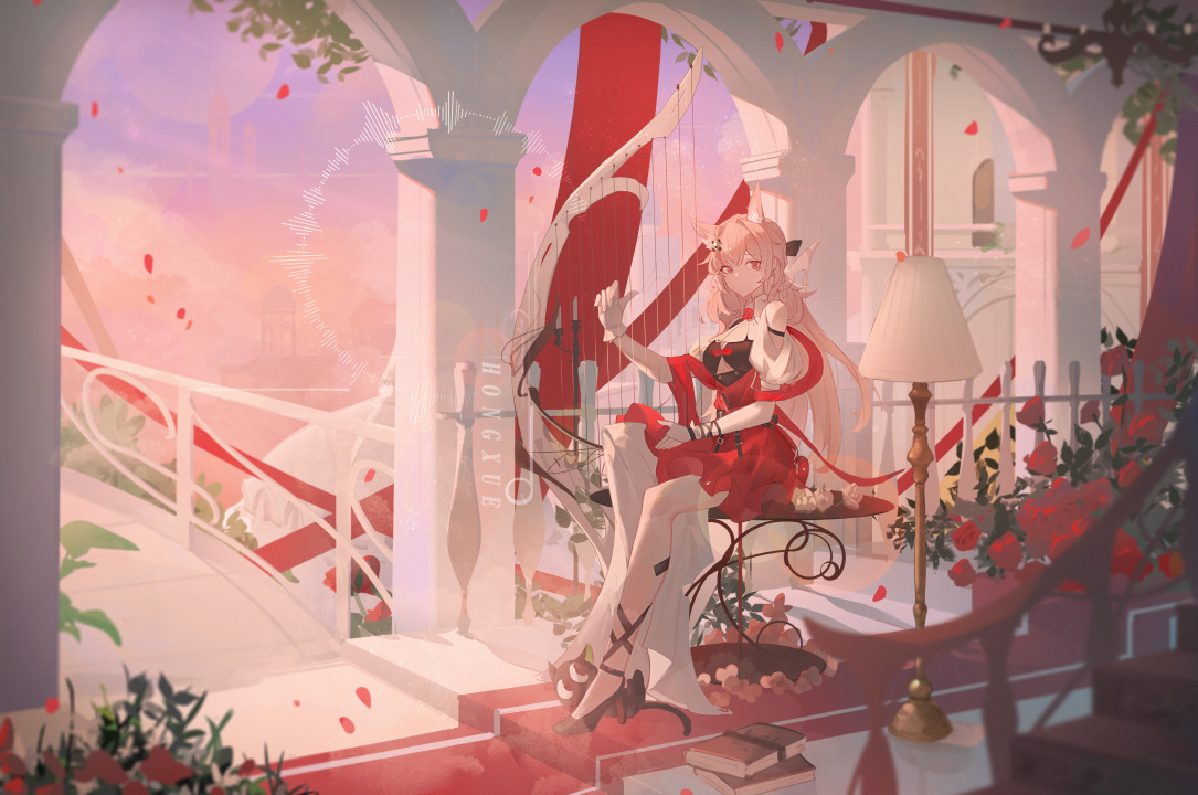 坐着、长发、狐狸耳朵、狐耳、动漫、女孩、神枪手、花瓣、明日方舟、玫瑰、竖琴、乐器、书籍、高跟鞋、台灯、狐狸少女、兽耳、树叶、衣服