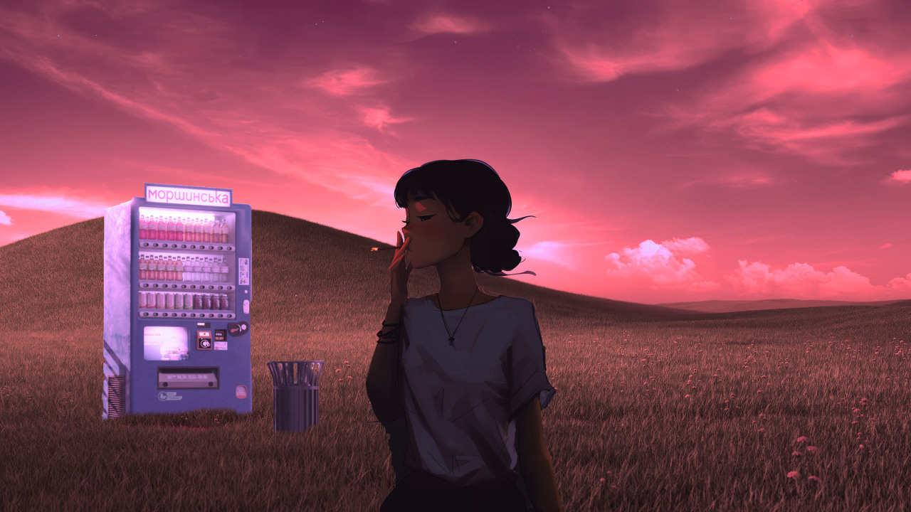 动漫、自动售货机、云、天空、香烟、项链、山草、垃圾箱