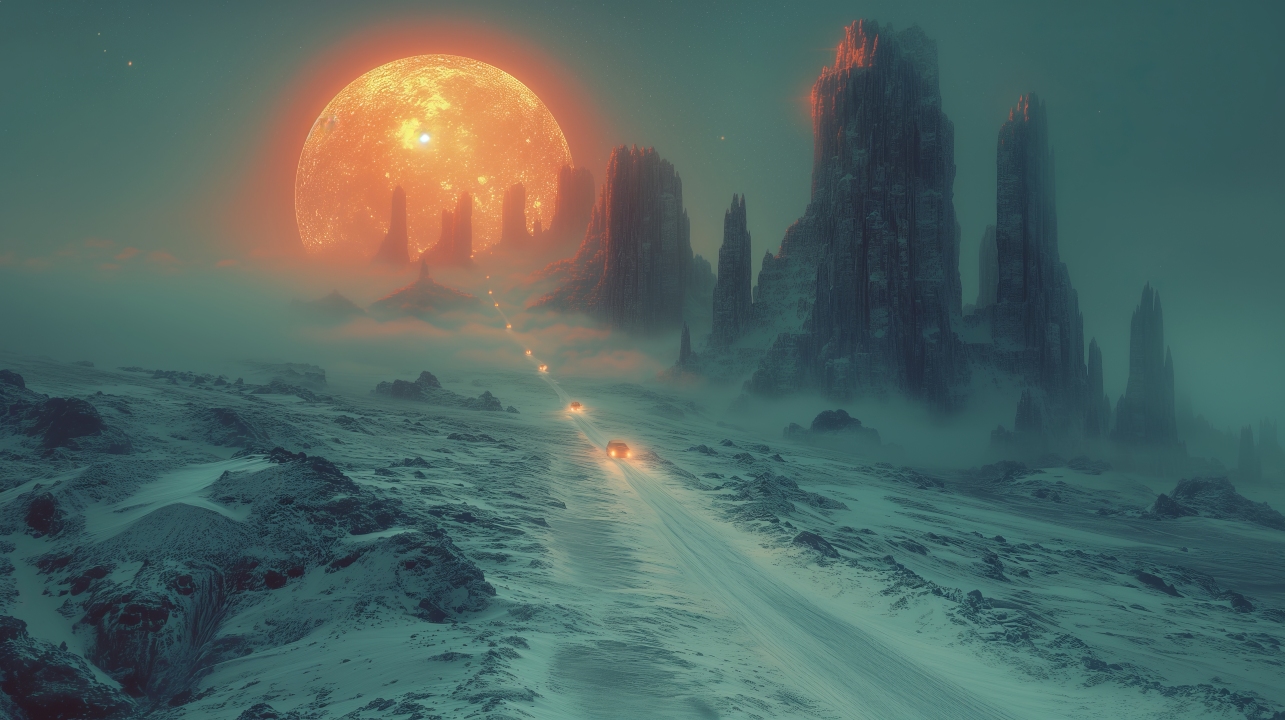 AI艺术、汽车、插画、太阳、山脉、雪景、冬天