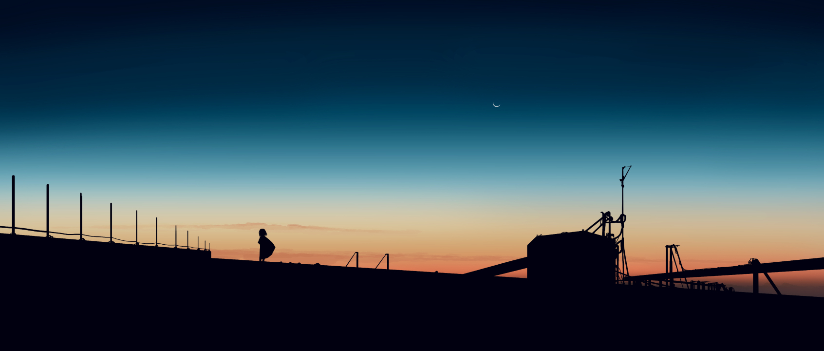 优雅、动漫女孩、日落、月亮、夕阳辉光、天空、新月
