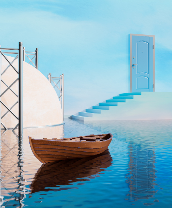 AI艺术、插画、蓝色、门、船舶、天空