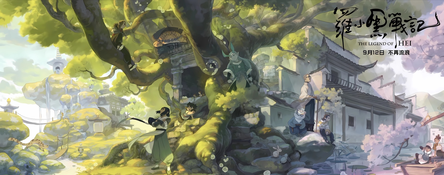 漫画、动漫男孩、动漫、树木、水、岩石、瀑布、天空、云