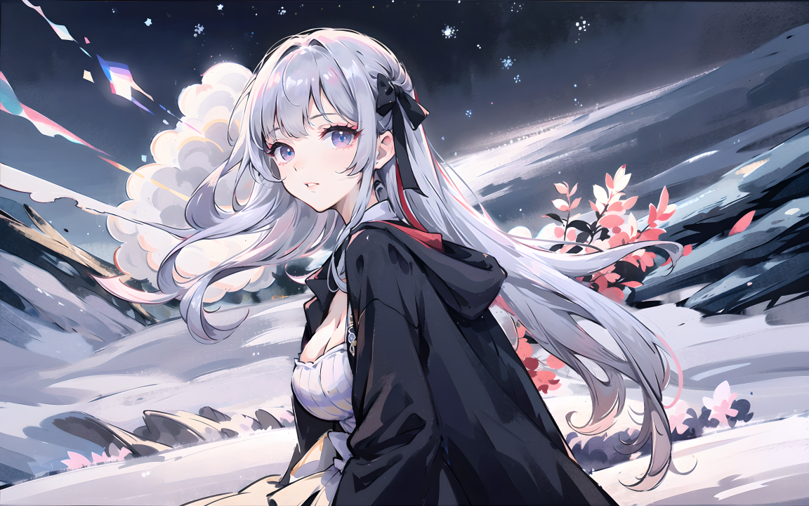 长发、艺术、银发、动漫女孩、雪、花瓣、紫色、眼睛、山