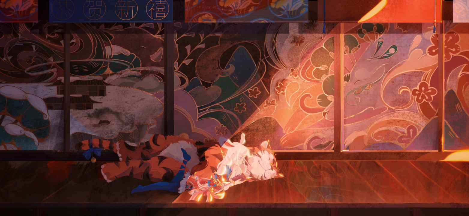 白发、老虎、阳光、兔耳朵、艺术、绘画、新年