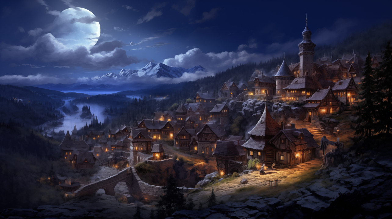 AI艺术、数字艺术、城市景观、街道、夜晚、中世纪、数字绘画