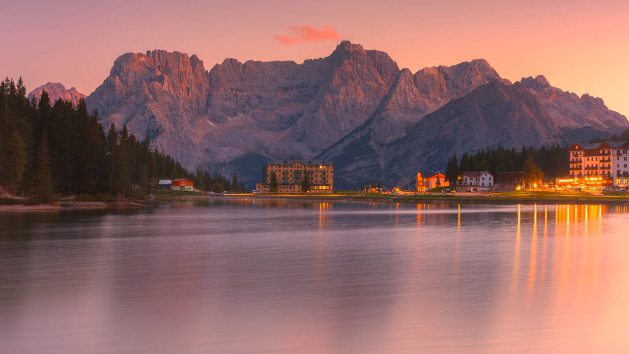 日落时分的山景与湖畔建筑