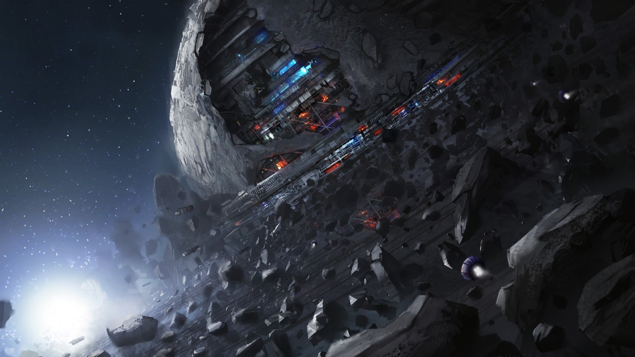 AI艺术、太空、宇宙、岩石、月亮、行星、恒星、空间站、建筑、科幻、未来主义、飞船、小行星带