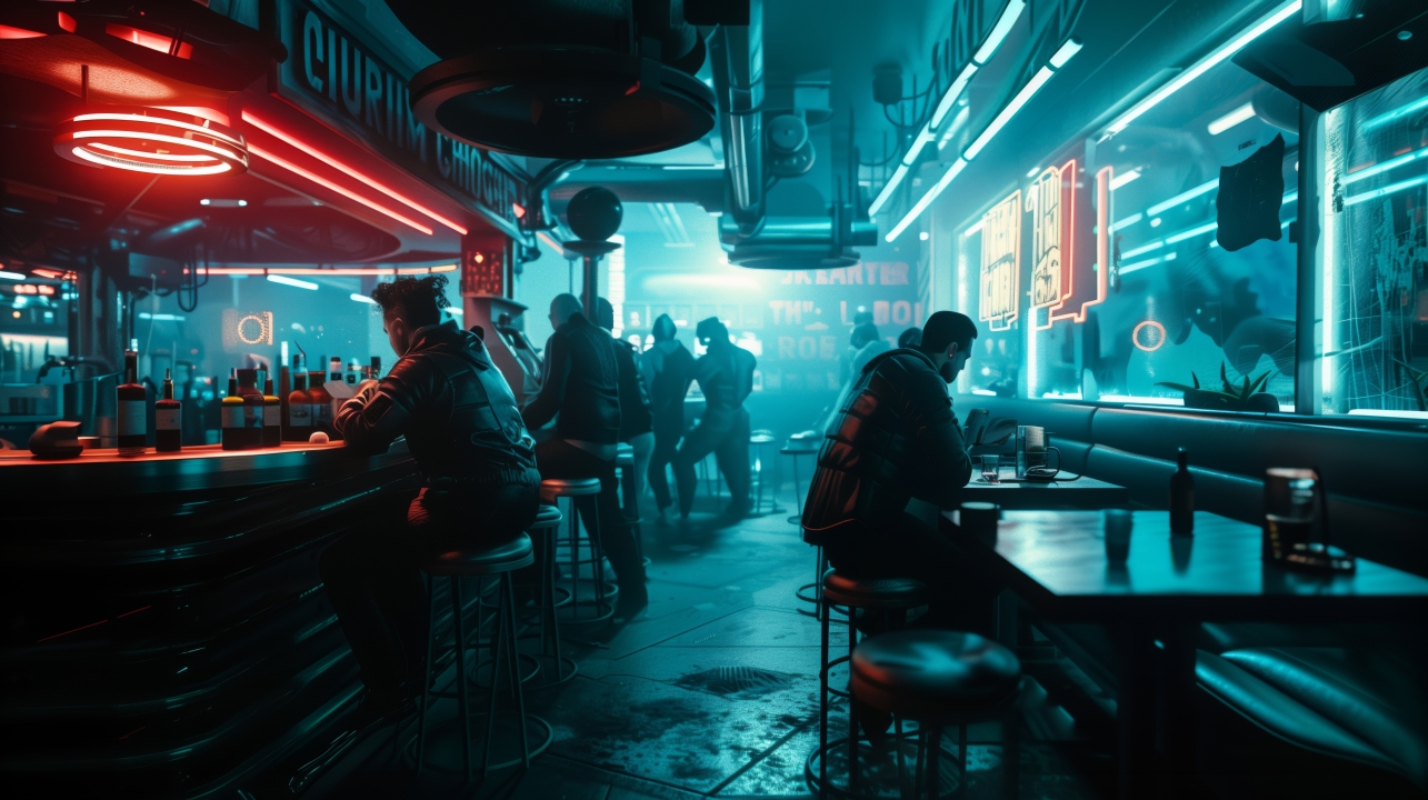 AI艺术、未来主义、赛伯朋克、科幻、霓虹灯、酒吧、黑暗