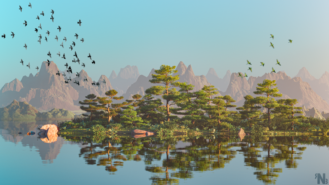 山、湖、树、鸟