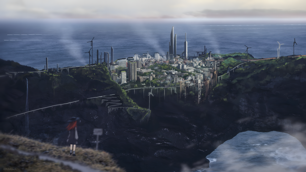 数字艺术、艺术品、海、摩天大楼、风力涡轮机、悬崖、城市景观