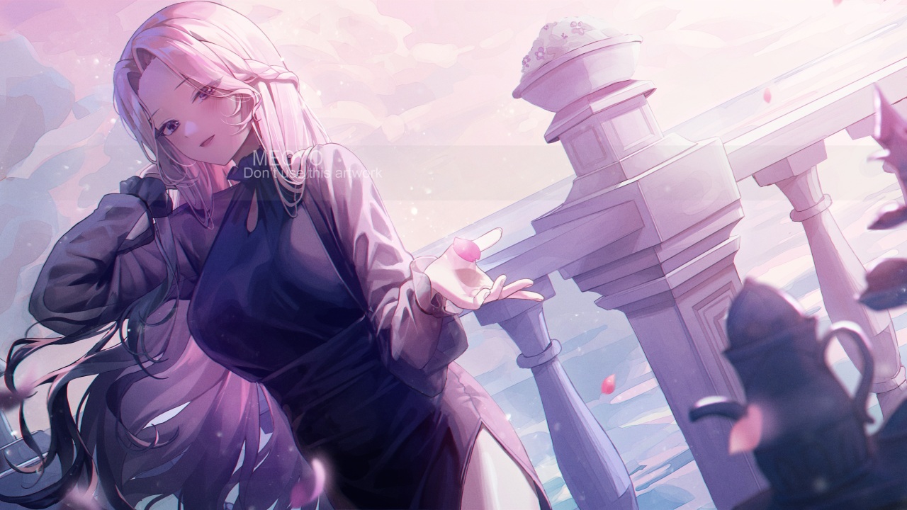 动漫、女孩、粉色、长发、海边、微风、花瓣