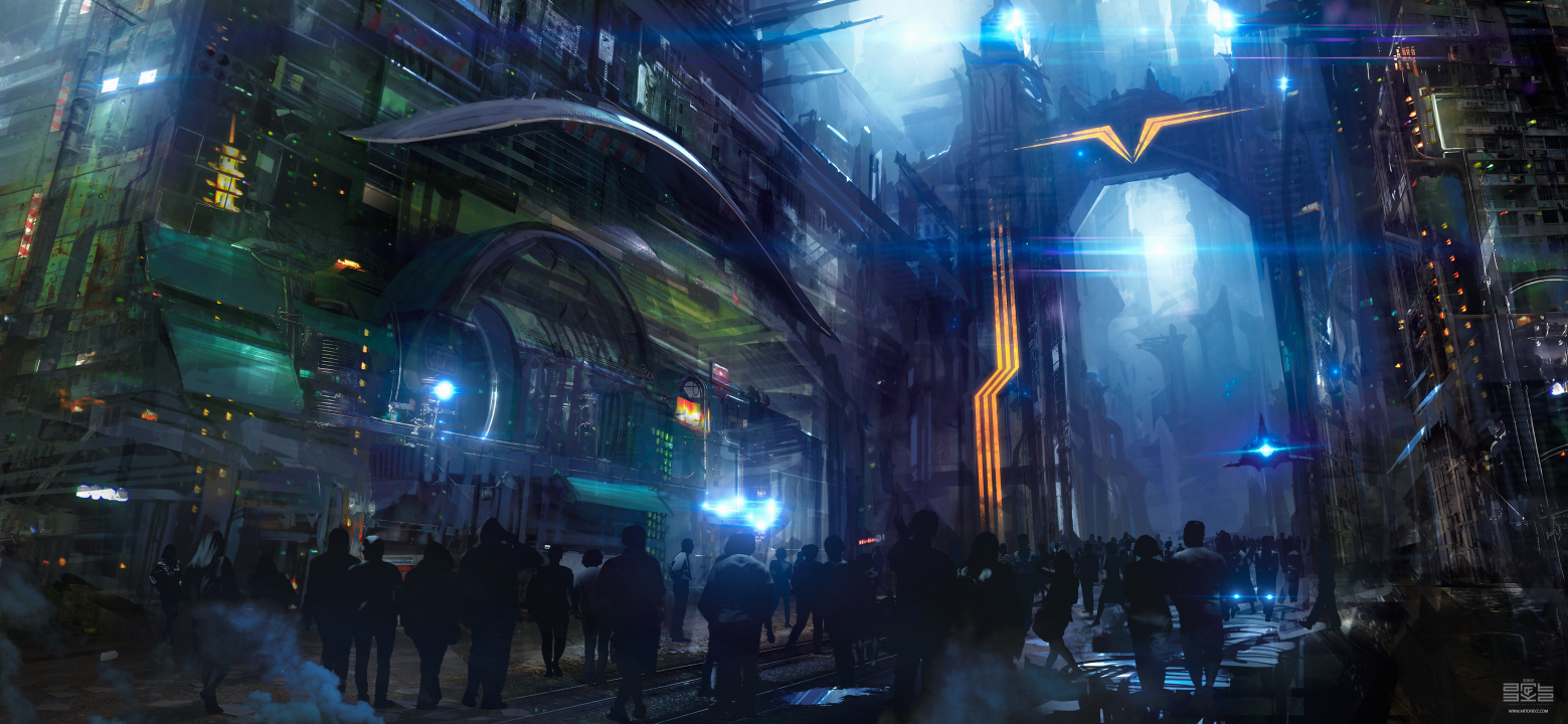 人物、AI艺术、插画、素描、数字绘画、概念艺术、环境、户外、未来主义、城市、镇、飞船、黑暗