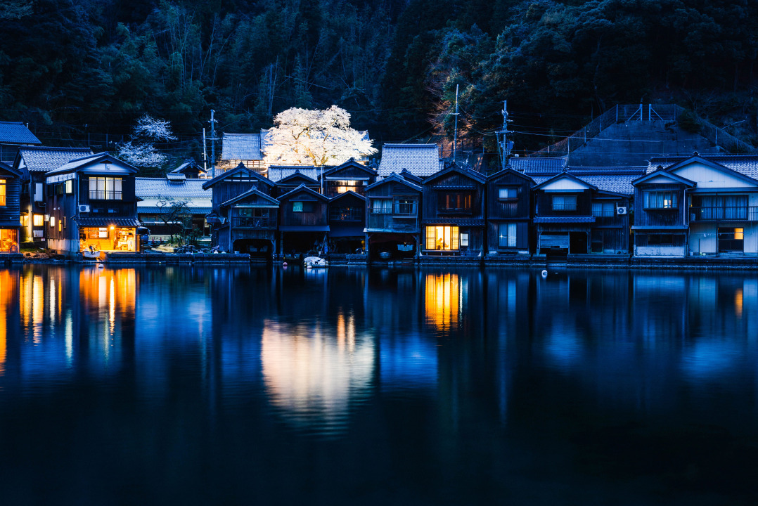 宁静的夜晚,樱花树下的倒影