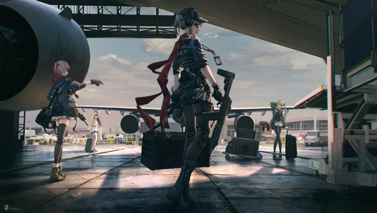 人物、持枪、女孩、机场、动漫女孩、枪支、行李