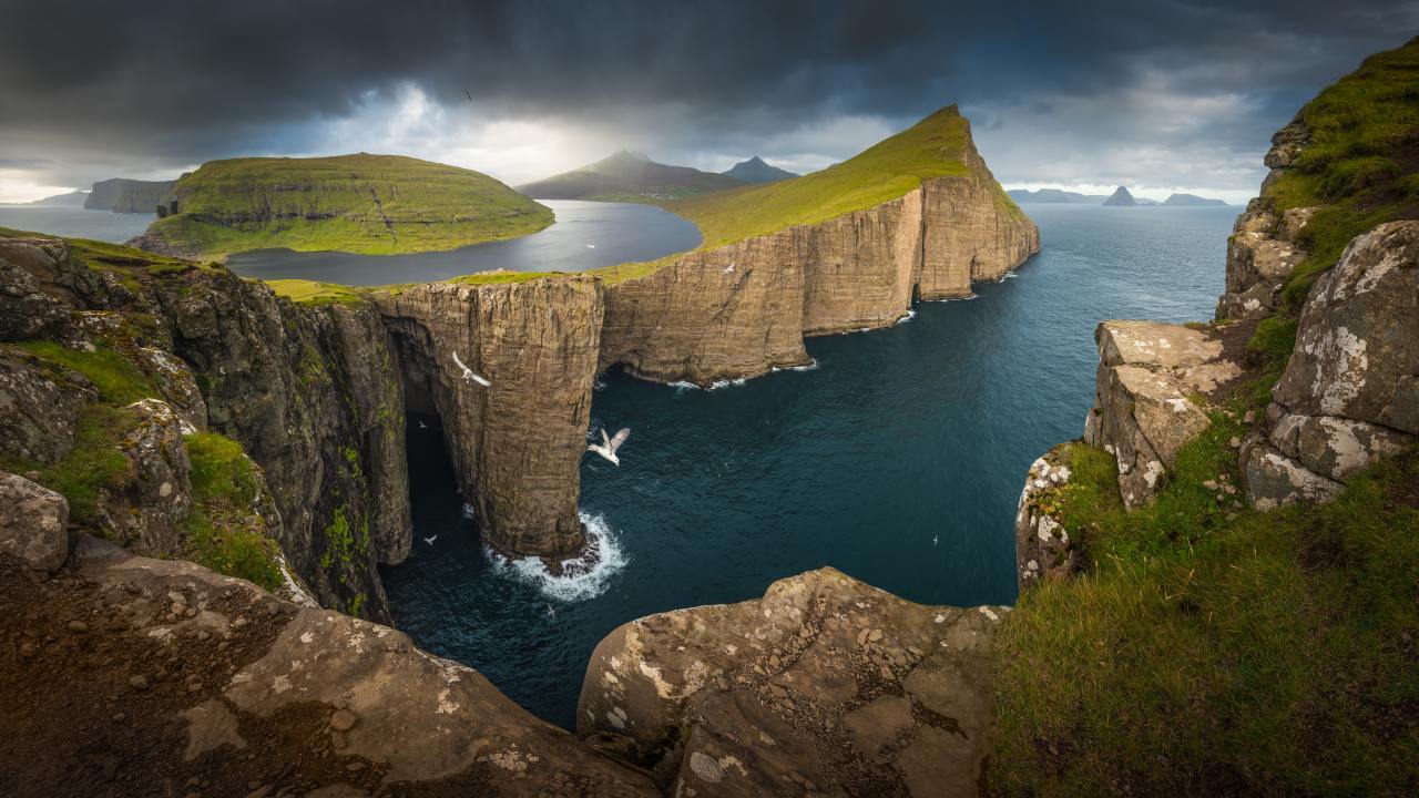 摄影、自然、风景、山脉、海洋、法罗群岛、岛屿、悬崖、水、云、草、鸟