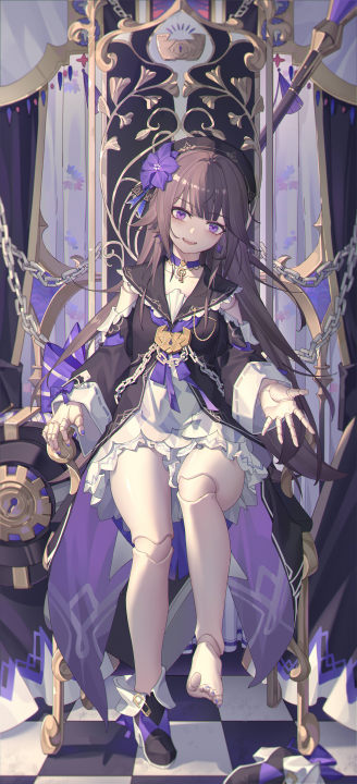 深色头发、长发、坐着、本海、星际铁路、关节、连衣裙、花裙子、发饰、长袖、紫色眼睛、鞋子、脱鞋、动漫、女孩、赫塔
