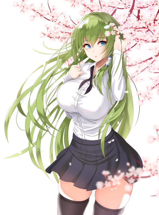 绿发、长发、动漫、少女、裙子、黑色丝袜、樱花