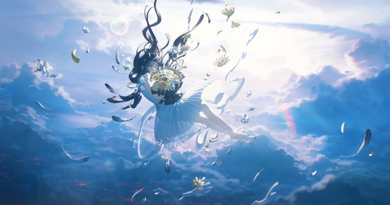 坠落、长发、白色连衣裙、花束、连衣裙、花、云、羽毛、花瓣、黑发、天空、阳光