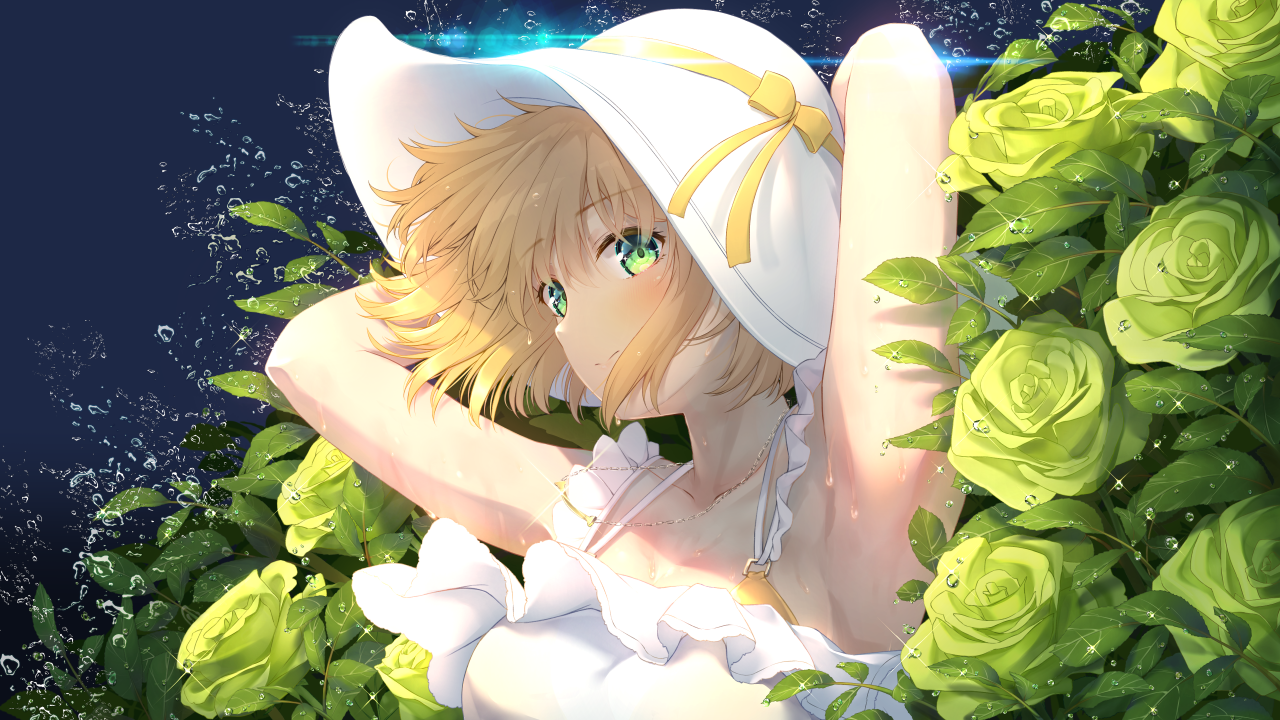 金发、绿眼睛、动漫、动漫女孩、AI艺术、肖像、帽子、太阳裙、鲜花、玫瑰