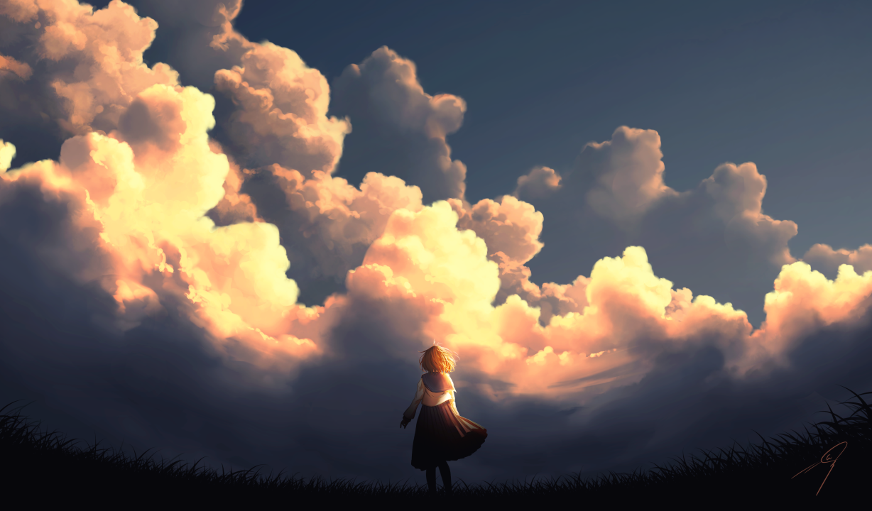 女性、AI艺术、插图、云、风景、校服、天空、日落、夕阳辉光