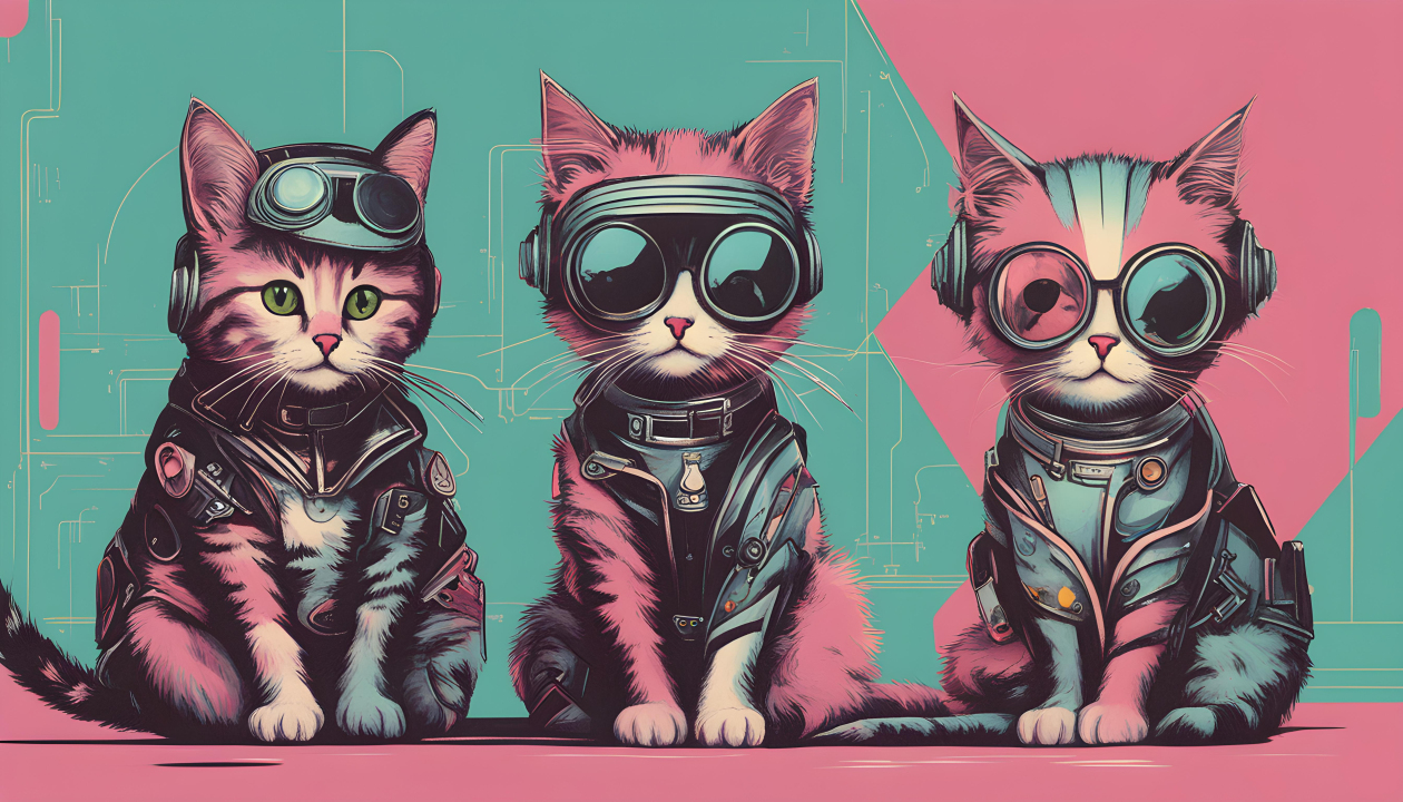 人工智能艺术、复古风格、未来主义、喵星人、护目镜、粉色、蓝色、朋克、动物