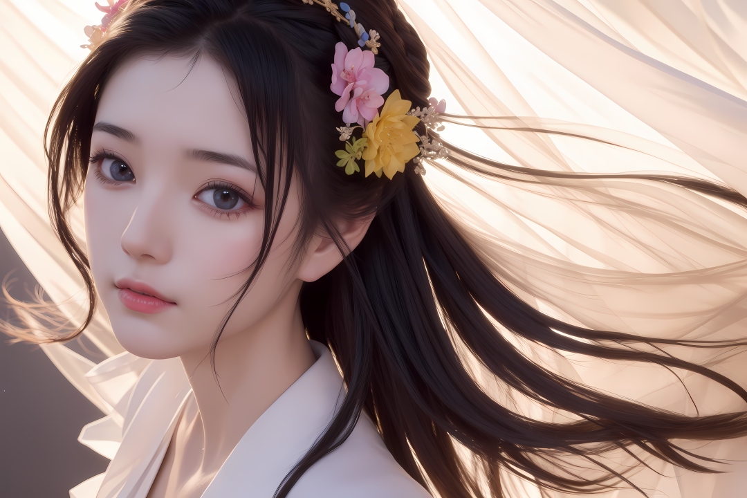 亚洲、女性、脸、长发、人工智能艺术、头发里的花