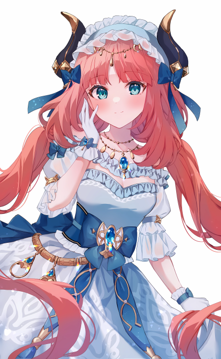 原神、长头发、红发、蓝眼睛、站立、动画、女孩、手套、项链、领结、连衣裙、极简主义、白色背景、简单背景