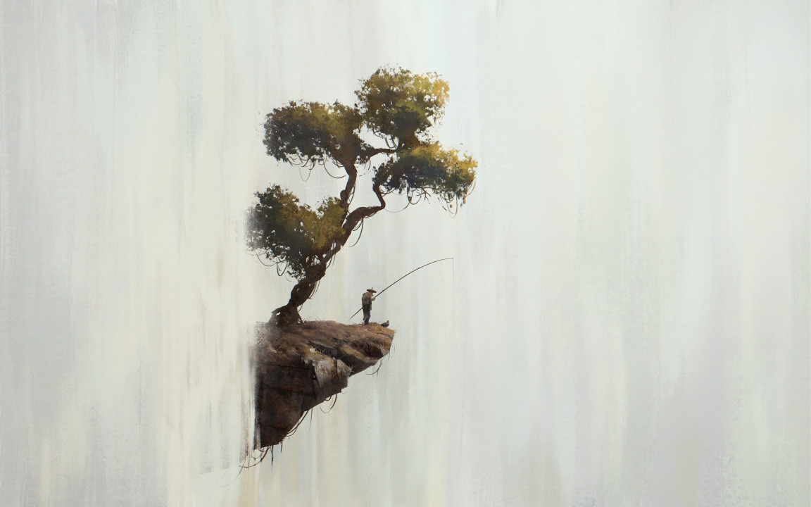 渔夫、瀑布、树木、岩石、印刷、雕刻