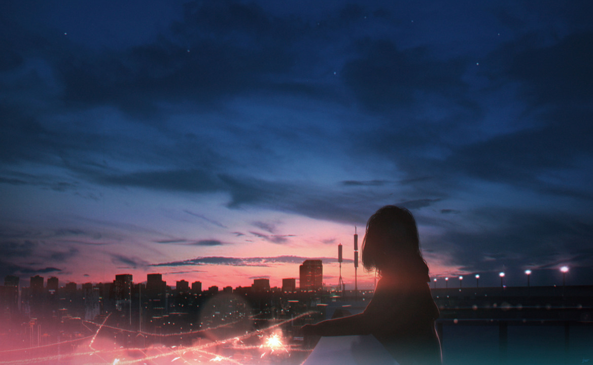 黄昏下的城市与动漫女孩