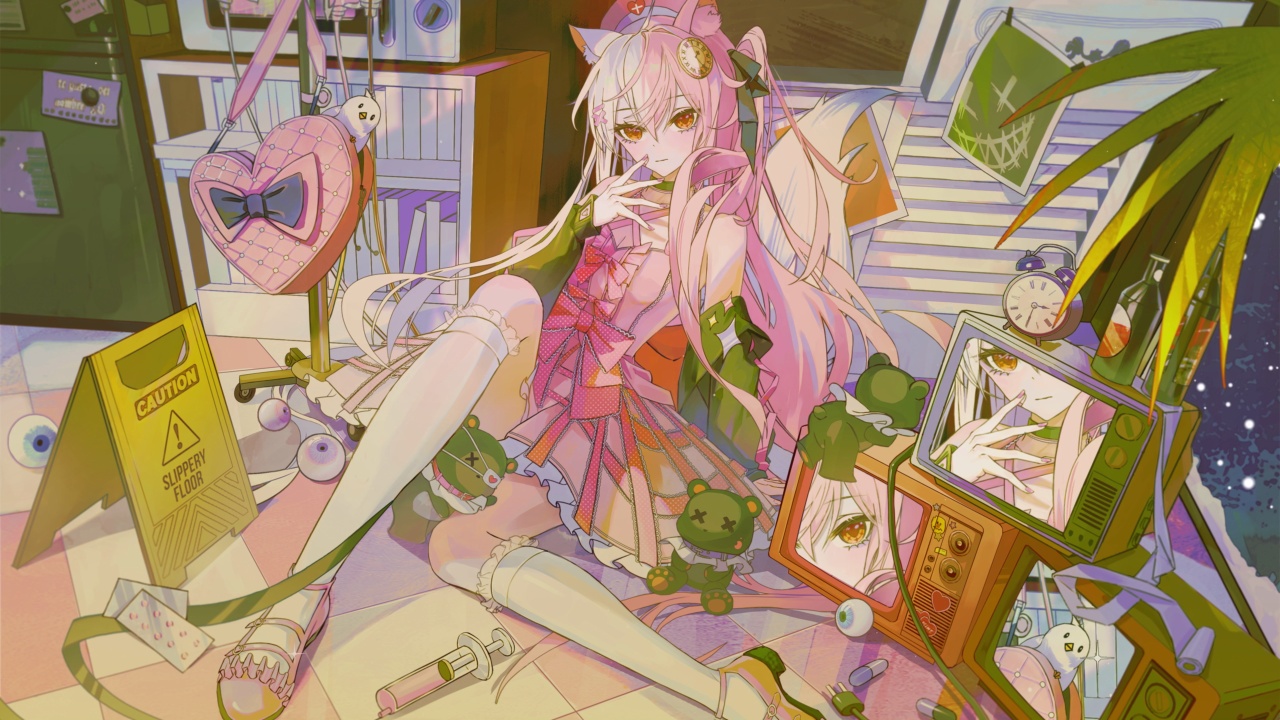 金发、长发、红色眼睛、动漫、动漫女孩、行星、兔耳朵、水中、太空、星星、斗篷、奇幻艺术