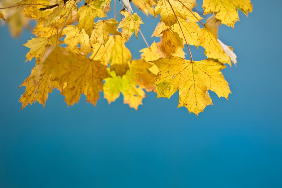 叶子、黄色、晴朗、天空、枫叶、秋天、树木