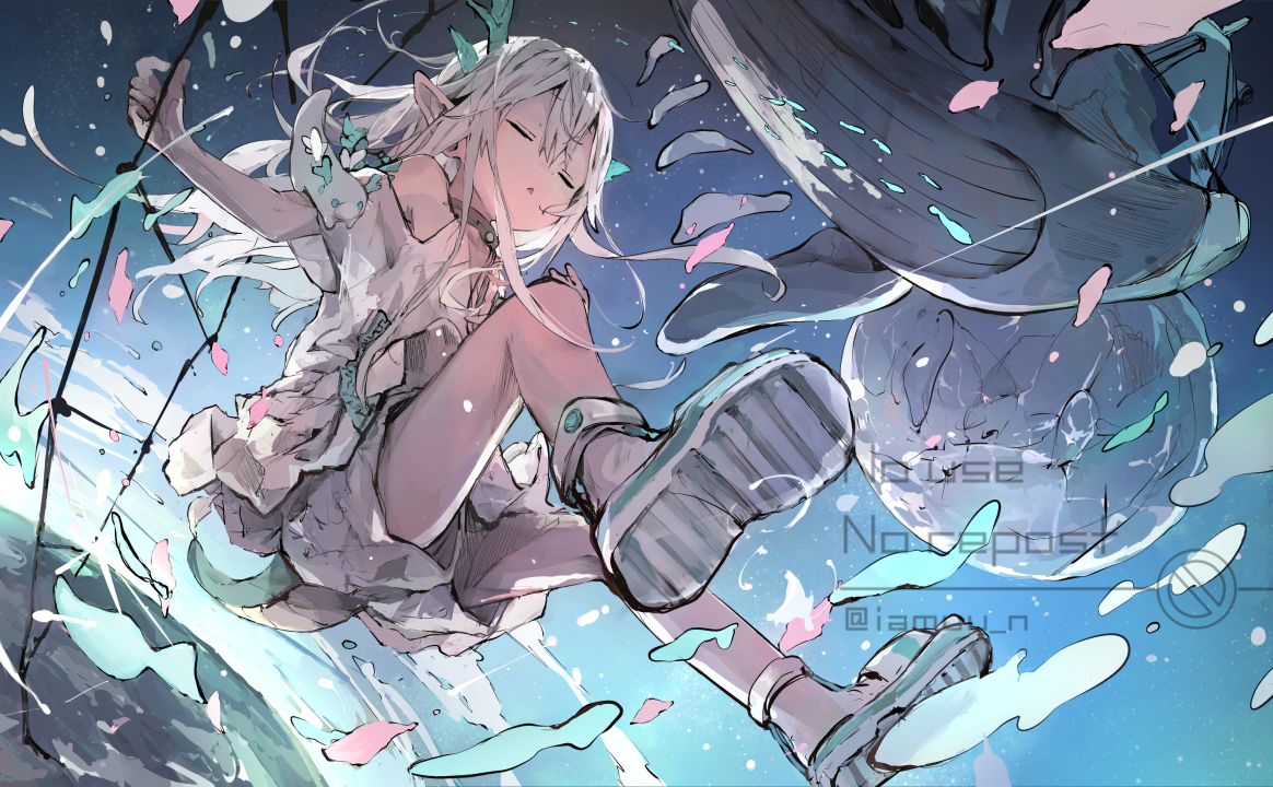 长发、紫色头发、动漫、女孩、连衣裙、水、紫色眼睛、天空、云彩、双尾、翅膀、太阳裙