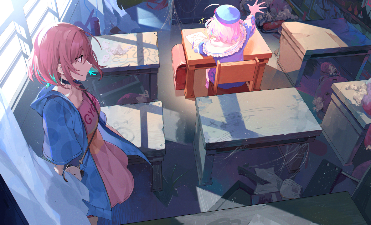粉色、头发、短发、动漫、动漫女孩、教室、阳光、艺术
