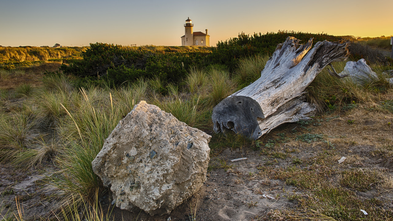 摄影、灯塔、草、风景、日落、余辉、岩石、建筑、地面